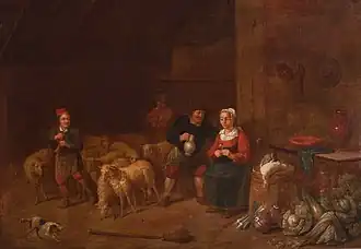 Jan Baptist Nollekens is mainly known for his genre scenes of peasants in interiors and merry companies. He showed the peasants in taverns, kitchen interiors, barns or outside. The peasants are depicted playing cards, drinking, smoking and engaged in courtship or conversation, He also painted an Artist and patrons in a studio.[6] His genre paintings appear influenced by those of Adriaen Brouwer and David Teniers the Younger.