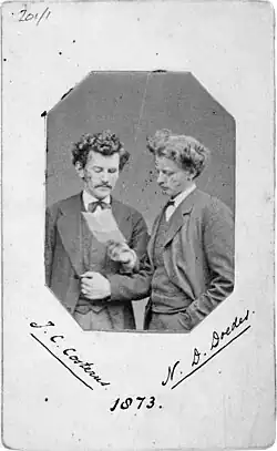 Costerus was born in Sneek[1] to Pieter Jacob Costerus and Wilhelmina Jacoba Cornelia Teengs. His father was a school administrator. He went to study botany at the University of Utrecht. His doctoral thesis of 1875 was on the lenticels (Het wezen der lenticellen). While still a student he read a Dutch translation of Darwin's theory of natural selection. Costerus and his fellow student Nicolaas Dirk Doedes (1850–1906) wrote a letter to Darwin and received a reply. They were so thrilled that they took a photo of themselves reading Darwin's letter and sent it back in their next letter in March 1873. Darwin and Doedes had a discussion on belief in God and the position of science.[2] Costerus studied plant variation.[3][4] At the age of eleven Costerus lost an eye. Costerus became a biology teacher at the first HBS in Amsterdam becoming its director later. He wrote a botany textbook and was a passionate nature enthusiast. One of his students was Joannes Jacobus Smith with whom he continued to collaborate in botany with Smith working on plants in Dutch Java.[5][6] After Costerus retired, he moved to Hilversum in 1920 where he established a garden next to the library. In this garden he wanted to introduce the public to wild plants of the Netherlands, many of which the public saw as "weeds". In 1929, the library moved, and a new garden was created at Zonnelaan. On his death in 1938 he bequeathed a sum of 1000 guilders to cover the maintenance of the garden to the Hilversum municipality. He was married to Anna Ringeling.[7]