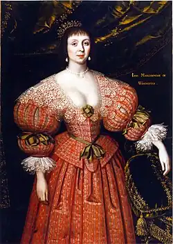 She died during childbirth on 15 April 1631 at Basing House.[5] She had an "impostume", an infected swelling of the mouth and cheek which had developed from a toothache, which caused a fever. Her child was stillborn during an intervention for the infection.[6] The circumstances of her death at Easter time in the presence of house guests including her grandfather Lord Rivers and her three sisters were noted in letters written by the Duchess of Buckingham, the Countess of Westmorland, and John Pory.[7]