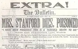 The San Francisco Evening Bulletin trumpeted the news with the March 1 headline "Mrs. Stanford Dies, Poisoned."[13][19] Forensic chemical analysis revealed the presence of a pure form of strychnine in samples from the bicarbonate she had taken,[f] as well as traces of the poison in her tissues.[13][15][g] After hearing three days of testimony, the coroner's jury concluded in less than two minutes that she had died of strychnine "introduced into a bottle of bicarbonate of soda with felonious intent by some person or persons to this jury unknown."[15] The testimony revealed that the bottle in question had been purchased in California (after Richmond had been let go), had been accessible to anyone in Stanford's residence during the period when her party was packing, and had not been used until the night of her death.[13][h]
