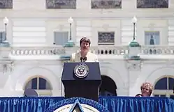 President-elect Bill Clinton had vowed to assemble an administration that "looked like America", and it was widely assumed that one of the major cabinet posts would go to a woman.[41][42] On February 11, 1993, Clinton introduced Reno as his nominee for United States Attorney General, stating that he wanted to hire a woman for the job but had also considered multiple male candidates.[39] Both of his previous choices, Zoë Baird and Kimba Wood, faced problems because both had employed undocumented immigrants as nannies.[7] Clinton said he had discounted Reno early in his search because she did not have experience in the Justice Department or federal law, but ultimately he came to understand that she had experience with a variety of criminal law issues from her role as State Attorney.[39][43] On March 11, 1993, the Senate confirmed Reno by a vote of 98 to 0.[44][45] She was sworn in the next day, becoming the first woman to serve as U.S. Attorney General.[41][46] As Attorney General, Reno oversaw the Justice Department and its 95,000 employees.[47] Reno remained Attorney General for the rest of Clinton's presidency, making her the longest-serving Attorney General since William Wirt in 1829.[7]