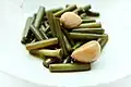 Main ingredients vary according to region and temperature. Some examples are green garlic, garlic scapes, radish, cucumber, chili pepper leaves, chamoe, perilla leaves, and deodeok.[8] Jangajji is usually pickled in soy sauce, soybean paste, or chili paste, but brine and diluted vinegar can also be used as the pickling liquid.[8] Usually, vegetables are slightly dried or salted to prevent the addition of surplus moisture to the condiment. When served, jangajji is cut, then seasoned with sesame oil, sugar, and toasted sesame seed powder.[9]