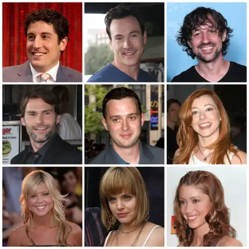 Jason Biggs (pictured in 2014), Chris Klein (2012), Thomas Ian Nicholas (2021), Seann William Scott (2012), Eddie Kaye Thomas (2008), Alyson Hannigan (2003), Tara Reid, Mena Suvari (both 2007), and Shannon Elizabeth (2006)