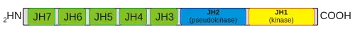 JAKs range from 120-140 kDa in size and have seven defined regions of homology called Janus homology domains 1 to 7 (JH1-7). JH1 is the kinase domain important for the enzymatic activity of the JAK and contains typical features of a tyrosine kinase such as conserved tyrosines necessary for JAK activation (e.g., Y1038/Y1039 in JAK1, Y1007/Y1008 in JAK2, Y980/Y981 in JAK3, and Y1054/Y1055 in Tyk2). Phosphorylation of these dual tyrosines leads to the conformational changes in the JAK protein to facilitate binding of substrate. JH2 is a pseudokinase domain, a domain structurally similar to a tyrosine kinase and essential for a normal kinase activity, yet lacks enzymatic activity. This domain may be involved in regulating the activity of JH1, and was likely a duplication of the JH1 domain which has undergone mutation post-duplication. The JH3-JH4 domains of JAKs share homology with Src-homology-2 (SH2) domains. The amino terminal (NH2) end (JH4-JH7) of Jaks is called a FERM domain (short for band 4.1, ezrin, radixin and moesin); this domain is also found in the focal adhesion kinase (FAK) family and is involved in association of JAKs with cytokine receptors and/or other kinases.[4]