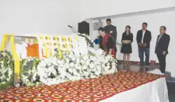 From Guwahati Airport, his body was flown to Naharlagun helipad at 12.00 noon where it was kept for an hour for the people to pay their last respects before being flown to Aalo where he was laid to rest.[9] Thousands including President Pranab Mukherjee, and Prime Minister Narendra Modi paid their respects.[10]