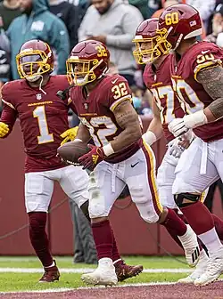 Jaret Patterson (born December 23, 1998) is an American professional football running back for the Los Angeles Chargers of the National Football League (NFL). He played college football for the Buffalo Bulls before signing with the Washington Commanders, then known as the Washington Football Team, as an undrafted free agent in 2021. Alongside Howard Griffith, Patterson holds the NCAA Division I Football Bowl Subdivision record for most rushing touchdowns in a single game with eight.