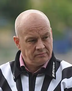 Jari "Japa" Levonen[1] (Born: 23 August 1966) is a Finnish former professional ice hockey winger and referee. Levonen represented the Porin Ässät and the Jokipojat during his player career. He has won the golden Whistle award 15 times in the SM-liiga, being the best referee voted by players 15 times in a row between 2002 and 2017.[2] He has also won the Unto Wiitala trophy seven times as the best referee in Finland decided by SM-liiga's referee coaching group.[3] Levonen has the second most whistled games in the SM-liiga with 979, only behind Timo Favorin.[4] Levonen retired in 2020, but has officiated in preseason games.[5]