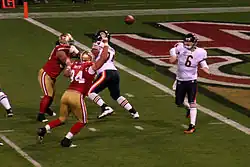 Cutler was the subject of most of the praise and criticism during the Chicago Bears' mercurial season. He began the season with 4 INTs in a loss to Green Bay, followed by seven touchdowns to one interception in three straight wins with a 100+ QB Rating.[87] The Bears lost eight of the next ten games behind Cutler's 11 touchdowns vs NFL-leading 20 interceptions. This included a Week 9 loss to San Francisco where Cutler threw a career-high five interceptions and no touchdowns, and a Game 14 loss to Baltimore where Cutler had career-worsts of 94 yards[88] and a passer rating of 7.9.[89][90] But Cutler again reversed direction in Game 15 against Brett Favre's division rival Vikings, where he threw four touchdowns, including a go-ahead late in the 4th quarter, and 31-yard game-winner in overtime.[91] He earned Offensive Player of the Week for his effort against the Vikings.[92] He then ended the season with another four-touchdown outing and win over Detroit. Cutler finished the season with 27 touchdowns, league-leading 26 interceptions, 3,666 yards passing, and career-worst passer rating of 76.8.[93]