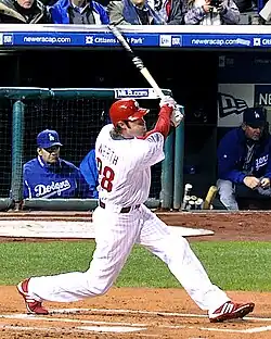 Entering the final year of his contract with the Phillies, a strong performance from Werth in 2010 had the potential to lead to an expensive long-term contract the following season.[77] After starting the year on a hot streak, batting .327 with none home runs and leading MLB with 22 doubles through his first 44 games, Werth then failed to reach base in his next five, striking out in 10 out of 17 at bats and taking a few days off to focus on adjusting his swing.[78] The slump extended well into July. Between May 21 and July 20, he batted only .236 with 55 strikeouts in 48 games, while the Phillies had a 22–29 record in that same time frame.[79] Werth also came under fire during this period when, on July 8, he yelled at a fan who caught a foul ball in the stands that Werth wanted to catch to end the inning. He apologized for the incident, which he said occurred "in the heat of the moment".[80] Werth then broke his 29-game home run drought on July 28 against Rodrigo López of the Arizona Diamondbacks,[81] and in the last 13 games before the Phillies clinched their postseason berth, he batted .354 with six home runs and 17 RBI.[82] For the season overall, Werth was second on the Phillies with a .296 average, 27 home runs, and 85 RBI; best on the team with 106 runs scored, a .388 OBP, and a .532 slugging percentage; and he led the entire NL with 46 doubles.[83]