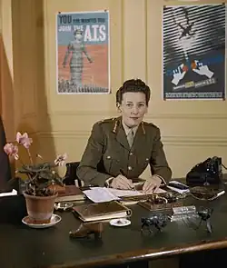 Knox was appointed Director, Auxiliary Territorial Service on 21 July 1941. She was given the acting rank of chief controller (equivalent to major general), while holding the war substantive rank of senior commander.[9] This made her the world's youngest general at that time.[2] One of her first actions as Director was to design a new, well fitting uniform for all ranks of the ATS.[10] She was promoted to war substantive controller (equivalent to colonel) and made temporary chief controller on 21 July 1942.[11] She travelled to Canada in September 1942 to inspect the Canadian Women's Army Corps and assisted in its recruiting campaign.[12] She returned to the UK in November following the seven-week trip.[13]