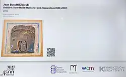 ![]() Photo from the 2019 exhibit at Spazju Kreattiv in Valletta, Malta of women artists from Malta or with connections to Malta. This image is of a monitor display (museum placard) describing the artist and the work of art– "Untitled (from Malta: Memories and Explorations 1989-2001)" 2002, mixed media on wood.[1] | |
