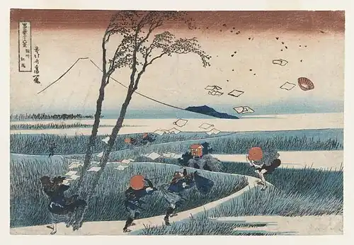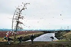 While Wall is known for large-scale photographs of contemporary everyday genre scenes populated with figures, in the early 1990s he became interested in still lifes.[19] He distinguishes between unstaged "documentary" pictures, like Still Creek, Vancouver, winter 2003,[20] and "cinematographic" pictures, produced using a combination of actors, sets, and special effects, such as A Sudden Gust of Wind (after Hokusai), 1993. Based on Yejiri Station, Province of Suruga (ca. 1832) a woodblock print by Katsushika Hokusai, A Sudden Gust of Wind recreates the depicted 19th-century Japanese scene in contemporary British Columbia, using actors and took over a year to produce 100 photographs in order "to achieve a seamless montage that gives the illusion of capturing a real moment in time."[21]