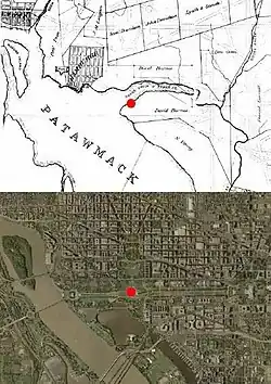 The 1804 stone marker replaced one of two wooden posts driven into the ground in 1793 at its site.[15] The marker was originally located on the south bank of Tiber Creek,[12] near the creek's confluence with the Potomac River. The area of the present National Mall west of the marker was under water until an engineering project that Peter Conover Hains directed from 1882 to 1891 created West Potomac Park.[16] East of the marker, Tiber Creek was transformed into the Washington City Canal.