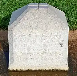 On December 2, 1889, John Stewart, a draftsman acting on the instructions of Colonel O. H. Ernst, Officer in Charge of Public Buildings and Grounds, erected a replacement marker above the recovered foundation of the original marker. According to 1898 and 1899 reports, an inscription on the west side of the replacement marker stated: "Position of the meridian post, erected September 20, 1793, and position of the Jefferson stone pier, erected December 18, 1804, and recovered and reerected, December 2, 1889."[15][18] (Silvio Bedini has written that these reports did not accurately describe the inscription.[19]) The marker was lowered to within 8 inches of its top, so that the inscription was not visible above ground.[15] In 1899, the ground on the west side of the pier was sloped so as to show the inscription on the Pier.[20]