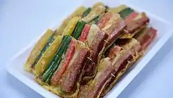Jeok (Korean: 적) is a Korean meat dish served with skewers.[1] Jeok is typically made with a large variety of meats, vegetables and mushrooms and is usually served on special occasions such as birthdays (hwangap) and wedding ceremonies. Jeok comes in multiple varieties, including sanjeok and nureum-jeok.