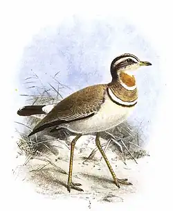Jerdon's courser (Rhinoptilus bitorquatus) is a nocturnal bird belonging to the pratincole and courser family Glareolidae endemic to India. The bird was discovered by the surgeon-naturalist Thomas C. Jerdon in 1848 but not seen again until its rediscovery in 1986.[3] This courser is a restricted-range endemic found locally in India in the Eastern Ghats of Andhra Pradesh. It is currently known only from the Sri Lankamalleswara Wildlife Sanctuary, and Sri Penusila Narasimha Wildlife Sanctuary where it inhabits sparse scrub forest with patches of bare ground.[4]