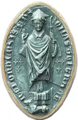 Evidence of the use of "Cantilupe ancient" last appears in the Camden roll of arms, c. 1280. for Johan de Cauntelo They are earlier listed as Gules, three fleurs de lys or for Sir George de Cantilupe (died 1273) in the Charles's Roll,[7] St. George's Roll,[8] and in the Camden Roll.[9] The arms of William de Cantilupe (died 1254) are listed even earlier in the Glover's Roll as: Gules, three fleurs-de-lys or.[10] The earliest record of the arms of "Cantilupe ancient" is in the seal of William de Cantilupe (died 1239). The antiquarian John Nichols (d.1826) in his History and Antiquities of the County of Leicester[11] records a deed dated 1215 relating to the first William de Cantilupe's manor of Brentingby, Leicestershire, on which the seal is three fleurs-de-lys circumscribed.