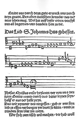 In Luther's time "Jesus Christus nostra salus" was attributed to the church reformer Jan Hus (a "Johannes" like Jenštejn).[3] Luther saw Hus as a precursor and martyr. Early prints of "Jesus Christus, unser Heiland, der von uns den Gotteszorn wandt" came under the header "Das Lied S. Johannes Hus gebessert" (The song of St. Johannes Hus improved).[3] Luther presented the hymn with several variants of the melody that had been associated with "Jesus Christus nostra salus" for over a century.[2][6]