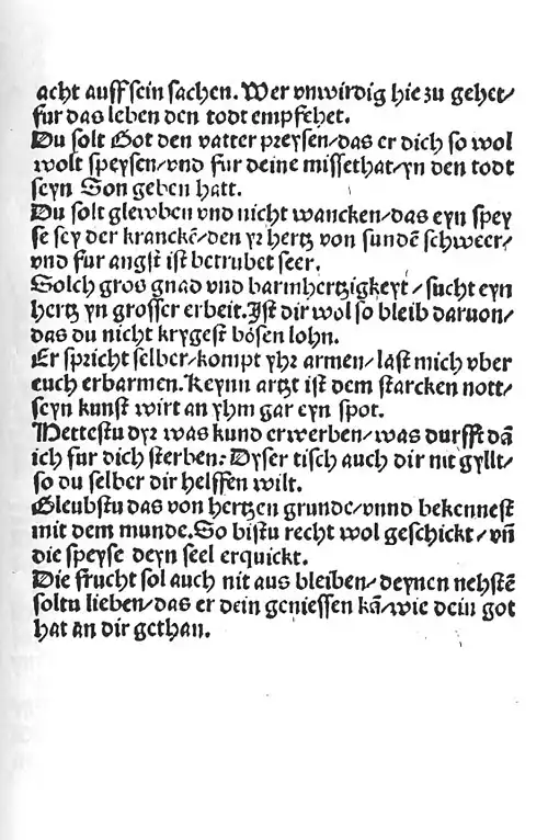 In 1524 Johann Walter's choral setting of the hymn appeared in Eyn geystlich Gesangk Buchleyn. Around a decade later Luther's hymn was included in the Klug'sche Gesangbuch. Michael Vehe, publisher of an early Catholic hymnal, Ein new Gesangbüchlin geystlicher Lieder (Leipzig 1537), provided a version in 22 stanzas intended for the feast of Corpus Christi.[9] That version has strong Counter-Reformation overtones.[10] Georg Rhau published Balthasar Resinarius' four-part setting of Luther's hymn in Newe deudsche geistliche Gesenge für die gemeinen Schulen (1544). Also the Babstsches Gesangbuch (1545) contained Luther's version. Johann Leisentrit included a version in eight stanzas (derived from Vehe's version but less militant) as a communion hymn in Geistliche Lieder und Psalmen (1567).[10]