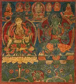 In Vajrayana, she is considered to be a Buddha, and the Tārā Tantra describes her as "a mother who gives birth to the buddhas of the three times" who is also "beyond saṃsāra and nirvāṇa."[3] She is one of the most important female deities in Vajrayana and is found in sources like the Mañjuśrīmūlakalpa, and the Guhyasamāja Tantra.[4] Key Indic Vajrayana texts which focus on Tārā include the Tantra Which Is the Source for All the Functions of Tārā, Mother of All the Tathagatas (Skt. Sarvatathāgatamātṛtārāviśvakarmabhavanāmatantra) and Tārā's Fundamental Ritual Text (Tārāmūlakalpa).[5][3]