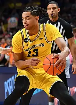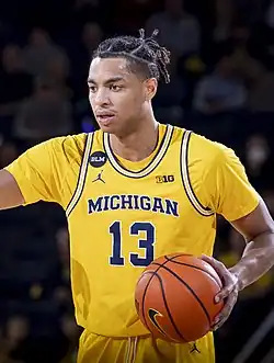Howard played his freshman season for the Michigan Wolverines. Michigan began the season on November 7, 2022, with a 75–56 victory over Purdue Fort Wayne. Howard contributed 21 points in his debut,[21] becoming the first Wolverine to debut with 20-plus points since Jamal Crawford posted 21 on November 19, 1999.[22] In his first week of play, he earned Big Ten Freshman of the Week recognition for the week ending November 13, 2022.[23] By early January, he was being mentioned as a future 2023 NBA draft lottery pick.[24][25] Howard posted a season-high 34 points on January 12, 2023, against Iowa, including Michigan's first 11 points and his first 5 three-pointers.[26] Howard was Michigan's second-leading scorer with 14.2 points per game and led the Wolverines with 78 made three-pointers. Following the regular season, he earned All-Big Ten third-team recognition from the media and honorable mention recognition from the coaches as well as All-Freshman recognition from the coaches, marking the fifth consecutive season that Michigan has had an All-Freshman honoree following Moussa Diabaté, Hunter Dickinson, Franz Wagner and Ignas Brazdeikis.[22][27] His 2.7 three-point shots made per game was second in the Big Ten.[28]
