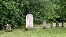 The Jewish Cemetery (Polish: Cmentarz Żydowski w Tarnogrodzie) in Tarnogród was probably established in 1588.[1] Located to the east of the synagogue, it covered an area of 1.8 hectares. During World War II, the Nazi Germans occupying Poland desacrated and destroyed the cemetery.[2] A few decades after the end of the war, from 1986 until 1990, the cemetery was renovated and partly surrounded by a wall to mark and protect it.[3] Around 100 pieces of recovered tombstones were placed within the area.[4] Some of the tombstones were embedded into the wall, becoming the so-called "commemoration wall". There is a monument to the memory of Poles of Jewish origin from Tarnogród who were murdered by the Germans in 1942.