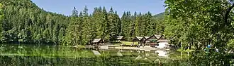 Jezersko has a long tourist tradition. There is a 3-star hotel in Jezersko[4] as well as private accommodation in self-catering units at vacation farms.[5] The location of the village offers exceptional views of the surrounding mountains, and it is a starting point for mountain hiking routes to Grintovec, Mount Kočna, and Big Peak (Veliki vrh). The Kranj Lodge at Ledine (Kranjska koča na Ledinah) and the Czech Lodge at Spodnje Ravni (Češka koča na Spodnjih Ravneh) mountain huts are well known to mountain hikers.[6] Lake Planšar (Planšarsko jezero) in Zgornje Jezersko is an artificial lake created after World War II. In winter skiing is also possible.