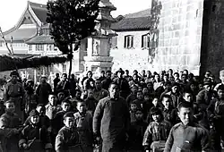 To dissuade Japanese invaders, Ji Ran used a legend concerning a Buddha head that was returned following the 1923 Great Kantō earthquake, persuading troops to spare hundreds seeking refuge in the temple.[7] He communicated with Japanese commanders via his Japanese-speaking student, Yue Ji, and once erroneously ascribed a soldier's death to an accident to avert reprisals against 20,000 refugees. Overwhelmed by these endeavors, Ji Ran died at the age of 46 in 1939. His memory is maintained in the UNESCO-listed Qixia Temple Refugee Shelter Memorial Stele and the film Qixia Temple 1937.[8]