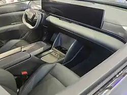 Visually, the 01 extensively reproduced the features of the prototype that preceded its debut.[7] Both the front fascia and the rear part of the body are decorated with full-width light strips made in Full LED technology, while a slender roofline gently sloping towards the rear, and the number of concavities and recesses is kept to a minimum in favor of flat surfaces. The manufacturer has abandoned traditional door handles in favor of motion sensors, and the doors open unconventionally: the front ones swing up and the rear ones open "against the wind".[8] The futuristic and minimalist passenger cabin was distinguished by the lack of a traditional steering wheel in favor of a steering wheel, while the dashboard, devoid of switches and traditional instrument layout, was created by a large, 35-inch display running across the entire width of the cockpit and displaying images in 3D technology.[9]