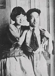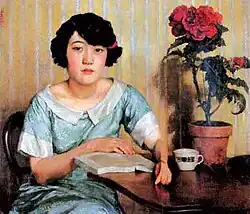 In 1916 her family moved to avoid conflict in Yixing and so that her father could be a professor at Fudan University in Shanghai. One of the student friends of her father was the ambitious and talented artist Xu Beihong.[2] He would come to visit her family and he and Jiang became close. Xu was set to go to Japan to study and Jiang was upset that she would shortly be married to the Zha family. Breaking the marriage agreement was virtually impossible, so they left a note behind and eloped to Japan. Xu gave her the name Jiang Biwei as a disguise, which later became better known than her real name. The embarrassment for her family was so great that her parents declared that she had died from an illness.[2] Their anger subsided after Jiang wrote a letter of apology from Japan. After six months the couple, whose funds had run out, moved back to Shanghai.[2] Xu was then offered a bursary to study in France by Cai Yuanpei of Peking University.[4]
