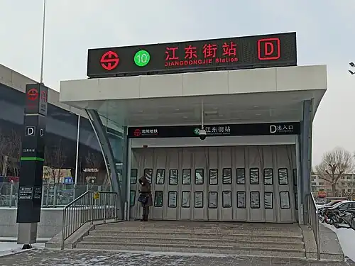 Jiangdongjie (Chinese: 江东街站; pinyin: Jiāngdōngjiē Zhàn) is a station on Line 10 of the Shenyang Metro.[1] The station opened on 29 April 2020.[2]