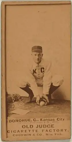 With Kansas City in 1888, he had his most playing time, as he was considered the starting catcher. He played in 88 games, hit .234, and had a career high 11 doubles.[1] That season, he was also used as a substitute umpire on two occasions, but for the game on July 14, it became dubiously notable. Bridegroom pitcher Adonis Terry claimed that he overheard Cowboy manager Sam Barkley order Donahue to call a Bridegroom runner out in the 9th inning of a 5-4 game. The Grooms walked off the field in protest‚ forfeiting the game‚ resulting in a 9-0 score.[4] In 1889, he returned to platooning, as the Cowboys promoted Charlie Hoover to starter.[5] Donahue caught 46 games that season and split the remainder of his games between the left field and third base, while hitting .234, and 32 runs batted in.[1]
