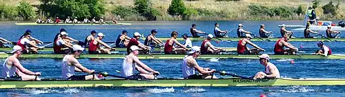 The University of Washington (foreground) at the 2019 IRA Championships where they won the Ten Eyck Trophy