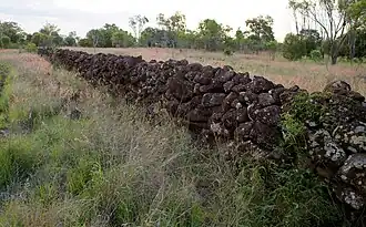 The Jimbour Dry Stone Wall is located on a low, stony ridge to the north of Jimbour Homestead, the former head station on the once expansive Jimbour pastoral run on the Darling Downs. The wall was constructed most likely during the 1870s, apparently as a barrier to prevent sheep from crossing the stony ridge, to keep dingoes from preying on the sheep and to prevent wallabies from destroying crops planted in paddocks close to the head station.[1]