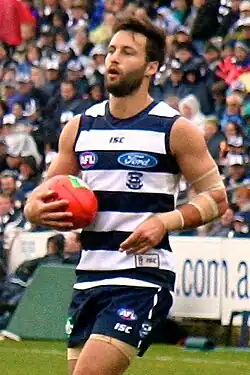 The Geelong Football Club drafted Bartel with their first selection and the eighth overall draft pick in the 2001 AFL Draft.[3] After making his debut in the opening round of the 2002 AFL premiership season, which was a heavy defeat to Essendon, Bartel went on to play in 11 out of a possible 22 senior games over the year.[4] After gathering 21 disposals in round 4, Bartel was awarded an AFL Rising Star nomination.[3] Having been dropped back to the club's VFL team to play out the second half of the season, Bartel played a key part in helping a young Geelong reserves side capture the 2002 VFL Premiership.[3] In helping the Cats defeat Port Melbourne by 22 points, Bartel saw the club secure its first major piece of silverware since 1982.[5]