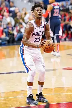 On November 12, 2018, Butler was traded, along with Justin Patton, to the Philadelphia 76ers in exchange for Jerryd Bayless, Robert Covington, Dario Šarić and a 2022 second-round draft pick.[72] He made his debut for the 76ers two days later, scoring 14 points in a 111–106 loss to the Orlando Magic.[73] On November 25, he recorded 34 points and 12 rebounds and made a 3-pointer with 2.3 seconds remaining to give the 76ers a 127–125 victory over the Brooklyn Nets.[74] On December 5, he scored a season-high 38 points in a 113–102 loss to the Toronto Raptors.[75] Two days later, he had a second straight 38-point game in a 117–111 win over the Detroit Pistons.[76] On January 29, Butler was shifted to point guard and had 20 points and six assists in a 121–105 win over the Los Angeles Lakers.[77] In game 1 of the 76ers' first-round playoff series against the Nets, Butler scored a game-high 36 points in a 111–102 loss.[78] In game 2 of the second round, Butler had 30 points and 11 rebounds to help the 76ers tie the series against the Raptors at 1–1 with a 94–89 win.[79] In game 6, he scored 25 points in a 112–101 win, helping the 76ers force a game 7.[80] In game 7, he made a layup with 4.2 seconds in the fourth quarter to tie the score at 90–all, but the 76ers eventually lost the game 92–90 following Kawhi Leonard's game-winning buzzer beater.[81]