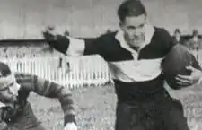 Sharman junior was born, as James Michael Sharman in 1912 at Narrandera, New South Wales. He attended his first Sydney Royal Easter Show in 1926 working in his father's tent.[4] Sharman junior played rugby league for Western Suburbs Magpies.[5] He was fullback in Western Suburbs' 1934 premiership win against the Eastern Suburbs. In 1938 he became First Grade captain. He retired after 7 seasons in 1939 to become a journalist, taking over the boxing tent from his father in 1955.[6] Sharman played 45 games between 1935 and 1939, scored 12 tries and kicked 11 goals. He died on 26 April 2006, aged 94.[7] He was awarded life membership in 1998.[8]