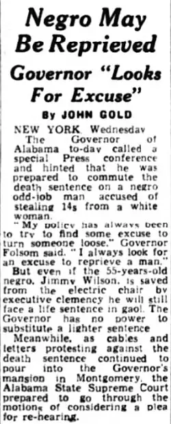 While it was difficult to find anyone who would speak in Wilson's defence in his home town, the case received international coverage, with critical articles appearing in newspapers all across the world.[6] Protest groups were formed and petitions were sent demanding that the death sentence be overturned.[16] The US embassy in London received approximately 600 protest letters.[17] Governor of Alabama Jim Folsom received over 1,000 letters per day urging clemency for Wilson.[3] The British Labour Party and the International Commission of Jurists likewise sent letters urging clemency.[18] Even the Alabama-based Birmingham Post-Herald urged for clemency.[19] The incident was used as propaganda in the Communist press.[20]