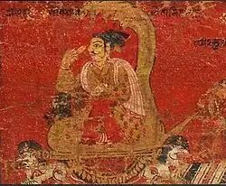 ![Miniature of Jitamitra Malla (left) from a Paubha dated 1670; sitting behind him are his brother Ugra Malla, his stepmother Annapurna and his half-sister Nandini.[7]](./_assets_/Detail_of_Nepalese_painting_6942073737474.jpg)