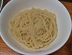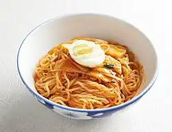 Jjolmyeon (Korean: 쫄면) is either a type of Korean noodle with a very chewy texture made from wheat flour and starch, or a cold and spicy dish bibim-jjolmyeon (비빔쫄면) made with the noodles and vegetables.[1] Jjolmyeon can add many vegetables such as cabbage and bean sprouts. The spicy and hot sauce is a combination of gochujang (chili pepper paste), vinegar, sugar, and minced garlic. It is also a type of bibim guksu (mixed noodles).