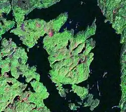 Satellite image of a portion of Lake Temagami and the surrounding landscape. The Joan Peninsula is in the middle.