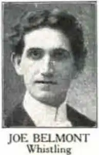 Joe Belmont was the stage name of Joseph Walter Fulton (July 22, 1876 – August 29, 1949) who was a whistling performer and baritone in the United States who came to be known as "The Human Bird".[1] He was one of the most popular recording artists in the years leading to 1900 and sang as a baritone and whistled for the Columbia Quartet along with Albert Campbell, Jim Reynard and Joe Majors. His top-selling records included "Beautiful Birds, Sing On", "Tell Me, Pretty Maiden" (with Byron G. Harlan, Frank C. Stanley, and the Florodora Girls, Columbia 31604, 1901).[2]