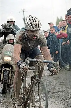 In 1996 he won the Brabantse Pijl,[10] but was third in the Tour of Flanders after suffering mechanical failure.[11] The next week, he finally claimed his first victory in Paris–Roubaix. His Mapei–GB team dominated the race and Museeuw arrived together with his Italian teammates Gianluca Bortolami and Andrea Tafi on the Roubaix Velodrome.[12] Team manager Patrick Lefevere received a phone call from the office of Mapei's managing director, Giorgio Squinzi, ordering Museeuw to win the race.[13] In the summer he won his second Belgian national road race title, but again failed to win a stage in the Tour de France. After a disappointing performance in Paris–Tours, where he wanted to secure his overall lead in the World Cup,[14] he stated he intended to quit cycling altogether. He changed his mind and started the next week in the world championship road race, where he was not considered a favourite because of the mountainous course in Lugano. To the surprise of many, and on his 31st birthday, Museeuw became world champion after a long breakaway with Mauro Gianetti, beating the Swiss in a two-man sprint.[3] Subsequently, he went on to win his second World Cup final standing.[15]