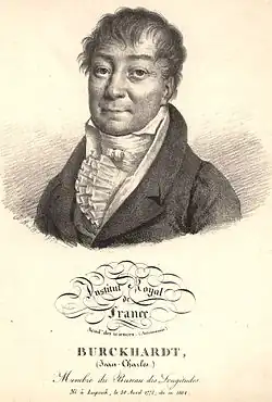 Burckhardt was born in Leipzig, where he studied mathematics and astronomy. Later he became an assistant at the Gotha Observatory and studied under Franz Xaver von Zach. On von Zach's recommendation, he joined the observatory of the École militaire in Paris, then directed by Jérôme Lalande. He was appointed as astronomer-adjoint to the Bureau des Longitudes and received his letters of French naturalization as a French citizen in 1799, and was elected to the L'Institut National des Sciences et des Arts in 1804. After Lalande's death in 1807, Burckhardt became director of the observatory at the École militaire.[1] He was elected a Foreign Honorary Member of the American Academy of Arts and Sciences in 1822.[2]