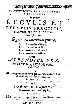 - Lantz, Johann (1619). Institutionum arithmeticarum libri quatuor (in Latin). Monachii: Nikolaus Heinrich.