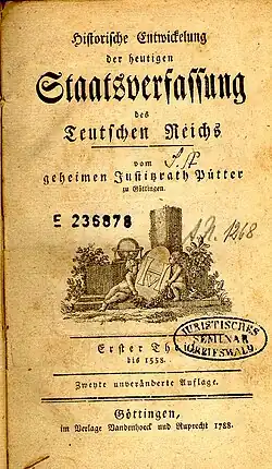 Johann Stephan Pütter (25 June 1725, Iserlohn – 12 August 1807, Göttingen) was a German law lecturer and publicist. He was professor of law at the university of Göttingen from 1746 until his death. He exerted great influence on the law institutions of his time. His principal work is Historische Entwicklung der heutigen Staatsverfassung des Deutschen Reichs (Historical development of the current constitution of the German Empire; 1786–'99).