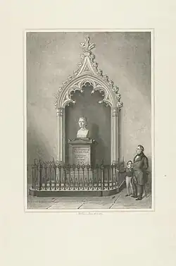 In 1843 a neo-Gothic monument designed and made by Flemish sculptor Louis Royer was erected by the Maatschappij der Nederlandse Letterkunde (Society of Dutch Literature) in the Pieterskerk, Leiden.[60]