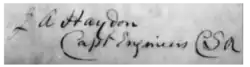 Following his parole in late 1862, Haydon reported to Col. Walter Stevens in the Department of Richmond and worked on rebuilding the Pocahontas bridge over the Appomattox River near Petersburg, Virginia as well as performing reconnaissance on the Potomac river near Point of Rocks, Maryland.[10] The following year in 1863, he was reporting to Col. Alfred L. Rives, acting chief of the Engineer Bureau of the Confederate States.[10] Later, he was again reporting to General Tilghman and supported the removal of four miles of railroad iron from the Rogersville branch of the East Tennessee and Virginia Railroad as part of the East Tennessee Campaign. The next year in 1864, Haydon reported to Colonel Gilmer, Engineers in the defense of Charleston (South Carolina) harbor.[10] [15]