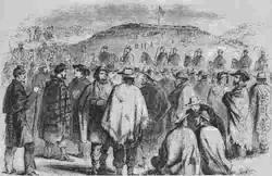 The following year, 1872, Roberts was not able to start recruiting for the 1872 Western survey until June.[11] Haydon had just completed the construction of the Frederick and Pennsylvania Line Railroad and was hired by Roberts. On July 23, 1872, Haydon led the railroad survey party from Fort Ellis, a United States Army fort, east of present-day Bozeman, Montana, consisting of Haydon, chief of party, two principal assistants, in charge of the compass and level, together with rodmen, chainmen, and others (altogether 20 men).[11] Haydon supply train consisted of almost seventy wagons with rations for 105 days and a small herd of beef cattle.[11] Haydon's military escort, commanded by Major Eugene Baker, Second Cavalry, consisting of four companies, 187 men, of the Second Cavalry, and four companies, 189 men, of the Seventh Infantry.[11][21]