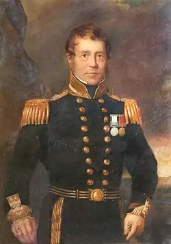 Carter served for a time aboard HMS Victory under Vice-Admiral Lord Nelson, and in February 1805 Nelson transferred him into an acting-lieutenancy aboard the 74-gun HMS Leviathan.[1] Admiral Lord Nelson awarded him with his sword and telescope for distinguished service under his command.[3] Carter then took part in the pursuit of the combined Franco-Spanish fleet to the West Indies during the Trafalgar Campaign.[1] He returned with the British fleet and took part in the Battle of Trafalgar, where his service involved securing the prisoners and destroying the prizes.[1] He was back in the West Indies by late 1806, where he navigated the badly leaking HMS Cerf back to Britain, fothering her hull with sails and with the pumps manned all throughout the voyage.[1] He captured the 14-gun Emille off St Valery in February 1814.[4] He was promoted to post-captain on 7 December 1815, and went on to become superintendent of the Royal Hospital Haslar after the end of the Napoleonic Wars.[4]